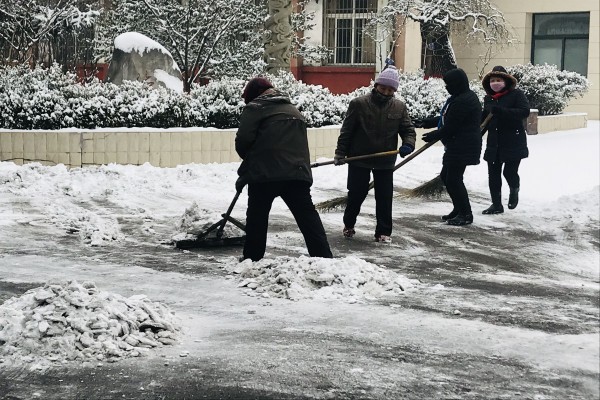清理中,天上依然飄著雪,但大家干勁十足,清雪工作緊張有序的開展,勞動現(xiàn)場一派繁忙的除雪景象,大家配合默契,有的手拿鐵鍬、有的手拿掃帚忙的不亦樂乎,嗞嗞聲、刷刷聲、混合著咚咚咚急促的腳步聲,經(jīng)過一個小時的勞動,辦公樓前路面的積雪和冰層被清掃一空,為礦區(qū)職工開辟了一條條洋溢著溫情的方便之路,為節(jié)日礦區(qū)奏響了一首新春交響曲。