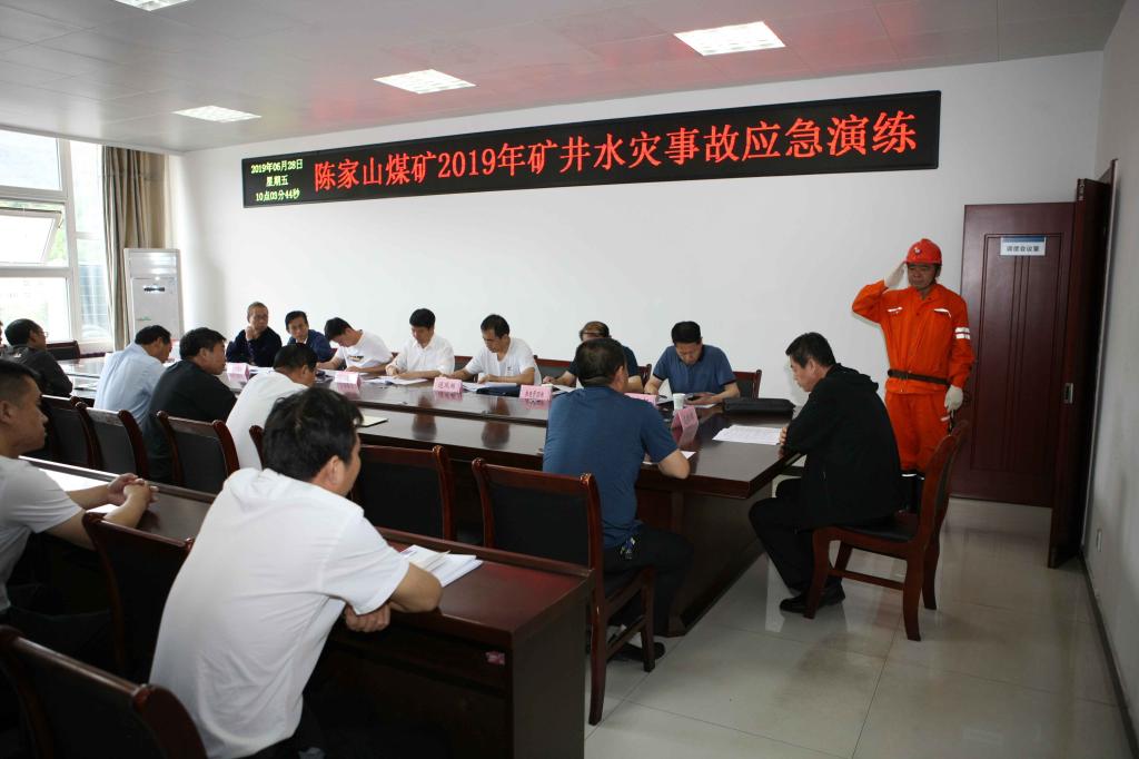 6月28日上午,隨著一陣急促的電話鈴聲響起,“419前落山發(fā)生水災(zāi)事故,涌水量不小于100m3/h,積水以淹沒(méi)后部溜子,情況緊急,已通知419工作面停產(chǎn)撤人……”。一場(chǎng)礦井水災(zāi)事故實(shí)戰(zhàn)應(yīng)急演練在陳家山煤礦正有條不紊地進(jìn)行著。