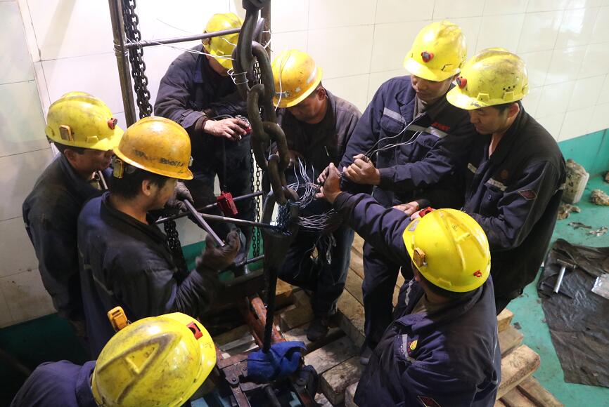 “副斜井絞車1200米鋼絲繩順利更換完畢,經(jīng)過半載重載、全速運行、緊急制動等試驗后,新制作的鉤頭牢固可靠,運行參數(shù)符合要求,可以投入生產(chǎn)?!?月11日下午16:00,經(jīng)過18小時的奮戰(zhàn),崔家溝項目部副斜井絞車提升鋼絲繩順利更換完畢并試車成功。