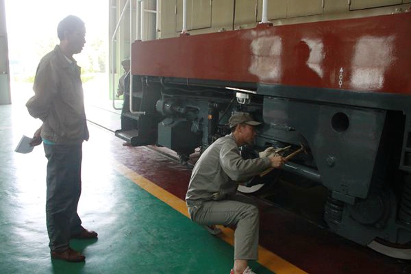 趙佳、張凡、劉航、馮海麟等新學(xué)員身穿工作服,手持小鐵錘,拿著考核單,開始對(duì)機(jī)車電器、制動(dòng)、柴油機(jī)、輔助間、走行部等模擬故障點(diǎn)進(jìn)行檢查。