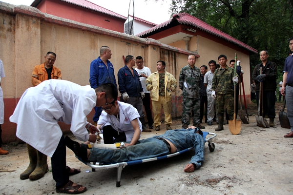 此次演練內(nèi)容預(yù)設(shè)該礦運(yùn)銷區(qū)辦公樓后山體因連日暴雨小面積滑坡,造成民房側(cè)墻垮塌,門(mén)前被淤泥封堵,房?jī)?nèi)一人被困,等待救援。接到事故救援匯報(bào)后,該礦立即啟動(dòng)應(yīng)急救援預(yù)案,現(xiàn)場(chǎng)救援組迅速趕往救援地點(diǎn),在應(yīng)急救災(zāi)總指揮部的指揮下,后勤保障組、醫(yī)療救護(hù)組、物資供應(yīng)組、治安穩(wěn)定組按預(yù)案責(zé)任分工有條不紊地開(kāi)展救援工作,演練過(guò)程緊張有序、配合默契,圓滿完成了應(yīng)急救援演練任務(wù)。