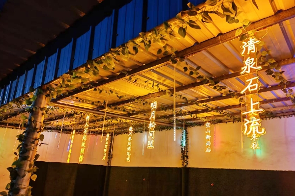 當夜幕降臨,煤臺的休息區(qū)仿佛被注入了魔力。暖黃色的燈光,透過翠綠藤蔓的間隙,灑下一片片斑駁的光影。王維筆下的詩句“明月松間照,清泉石上流”,化作靈動的燈飾,在微風中輕輕搖曳。藤蔓如綠色的瀑布般垂下,光影與綠意交織,營造出一種寧靜而雅致的氛圍,讓職工感受到了一絲別樣的詩意。