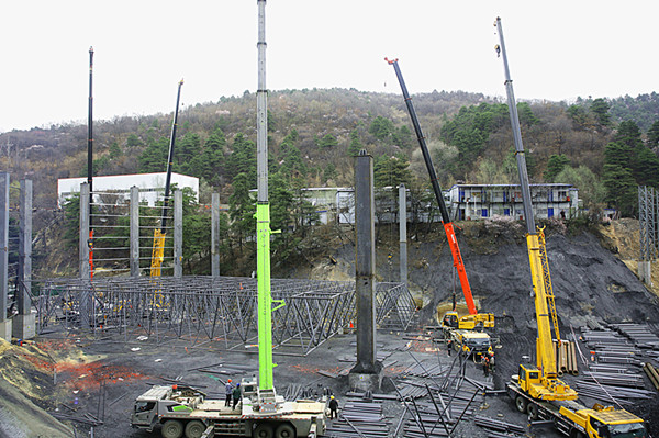 3月21日上午,隨著總指揮一聲令下,柴家溝井儲煤場封閉工程現(xiàn)場鞭炮齊鳴,四臺大型吊車從四個方位同時(shí)作業(yè),頂部整體鋼架架構(gòu)緩緩升起,柴家溝井儲煤場封閉工程封頂施工正式開始。