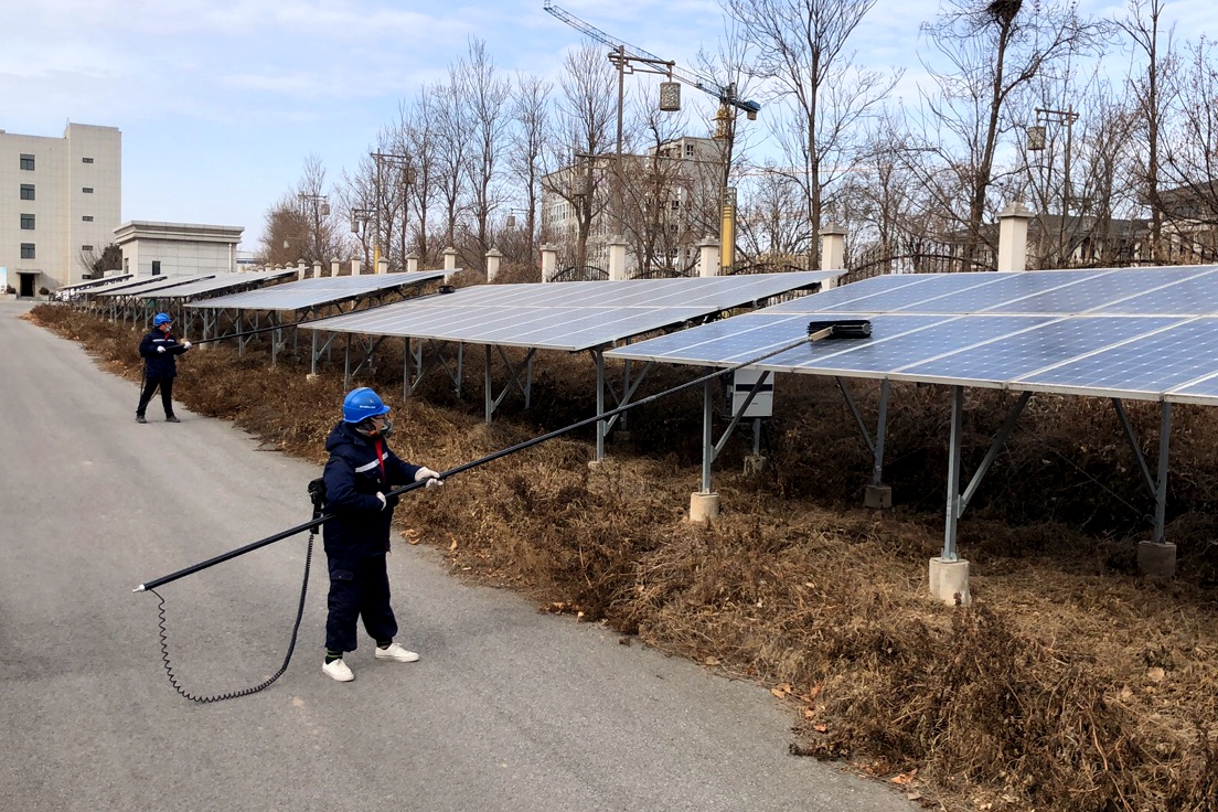 為提高新區(qū)6MW光伏發(fā)電站光伏板受光率,保證設(shè)備運(yùn)行正常。近日,該公司運(yùn)行維護(hù)部組織人員利用空余時(shí)間對(duì)光伏板面灰塵、雜草等進(jìn)行了“大清理”工作。