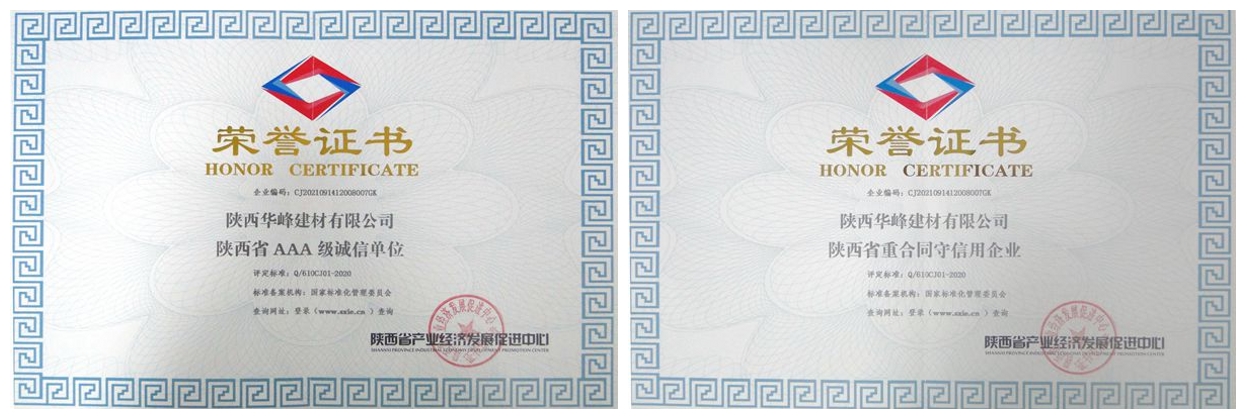 近日,從陜西省產業(yè)經濟發(fā)展促進中心獲悉,華峰公司被評為2021年度陜西省“重合同守信用企業(yè)”及“陜西省AAA級誠信單位”。榮譽的獲得,是公司高度重視合同管理和社會誠信體系建設的結果,為公司今后持續(xù)健康、快速發(fā)展提供了更加有力的信譽保障。
