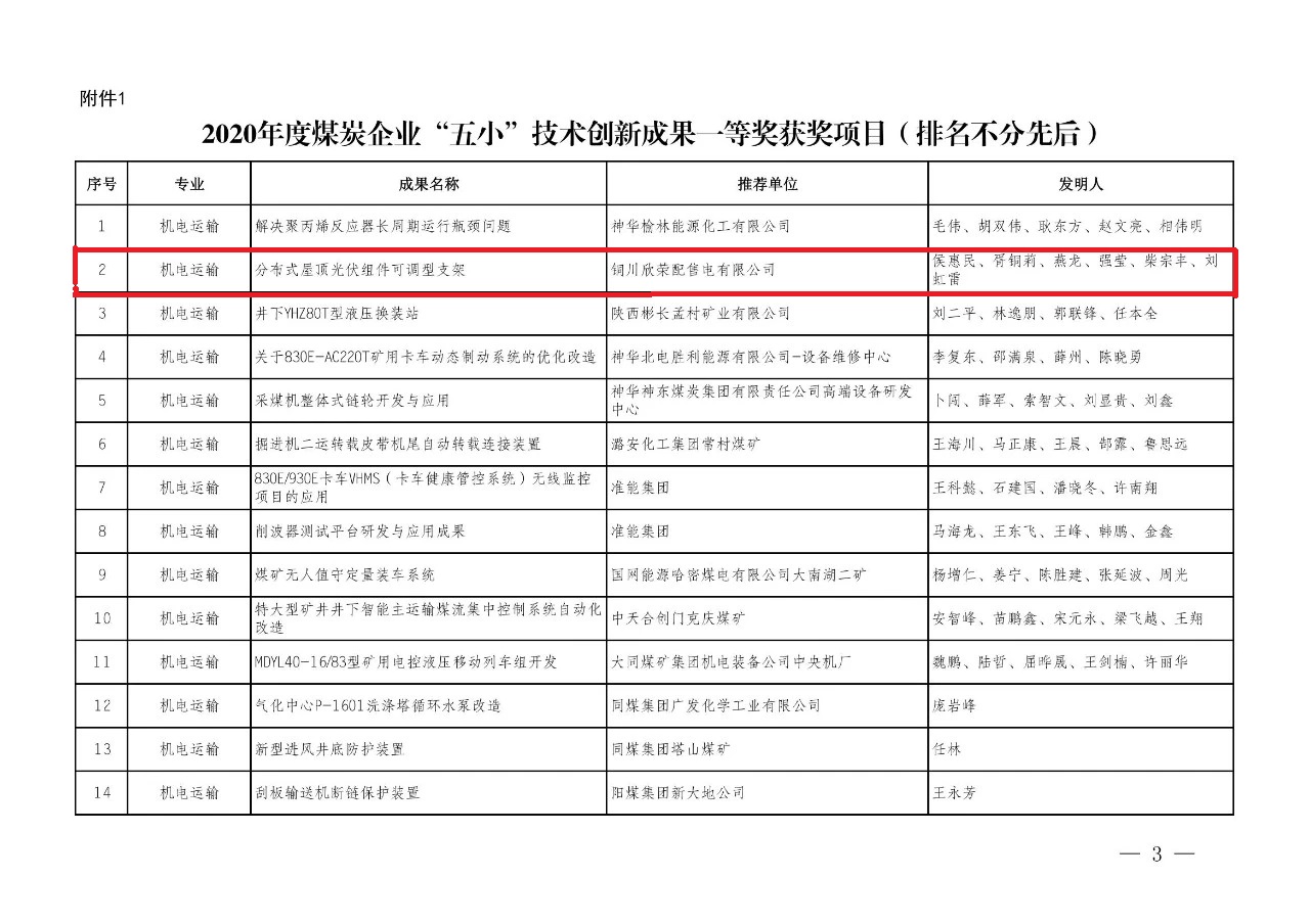 近日,中國(guó)煤炭工業(yè)協(xié)會(huì)公布了2020年度煤炭企業(yè)優(yōu)秀“五小”創(chuàng)新成果及征集活動(dòng)優(yōu)秀組織獎(jiǎng),欣榮配售電有限公司兩項(xiàng)職工技術(shù)創(chuàng)新成果上榜,《分布式屋頂光伏組件可調(diào)型支架》榮獲2020年度煤炭企業(yè)“五小”技術(shù)創(chuàng)新成果一等獎(jiǎng);《下焦進(jìn)線開(kāi)關(guān)防雷保護(hù)》榮獲2020年度煤炭企業(yè)“五小”技術(shù)創(chuàng)新成果二等獎(jiǎng)。