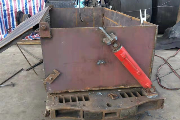 該礦原來(lái)使用的運(yùn)料車在人工卸載物料過(guò)程中,費(fèi)時(shí)費(fèi)力,勞動(dòng)強(qiáng)度大,工作效率低。針對(duì)這一問(wèn)題,該井機(jī)電部萌生了改良運(yùn)料車的想法。通過(guò)實(shí)地勘察和對(duì)職工的深入交流,自動(dòng)液壓翻斗車由機(jī)電部設(shè)計(jì)、機(jī)電隊(duì)實(shí)施,采用16毫米厚的鋼板焊接成長(zhǎng)2480毫米、寬1400毫米、高950毫米的四方形自動(dòng)液壓翻斗車斗,車斗左右兩側(cè)各附有一個(gè)液壓器,翻斗車斗前側(cè)用兩幅合頁(yè)和底板相連,通過(guò)兩個(gè)豎銷子完成閉合,翻斗車的箕斗用兩個(gè)閉鎖銷子與底部板車連接,當(dāng)需要卸載物料時(shí),工作人員只需將兩個(gè)液壓器與液壓管、液壓泵相連接,通過(guò)遠(yuǎn)方操作液壓泵一鍵啟動(dòng)按鈕,在液壓泵噴射的水壓作用下,兩個(gè)液壓器施力通過(guò)鐵制拉桿拽動(dòng)車斗上下翻動(dòng),實(shí)現(xiàn)物料自動(dòng)卸載。