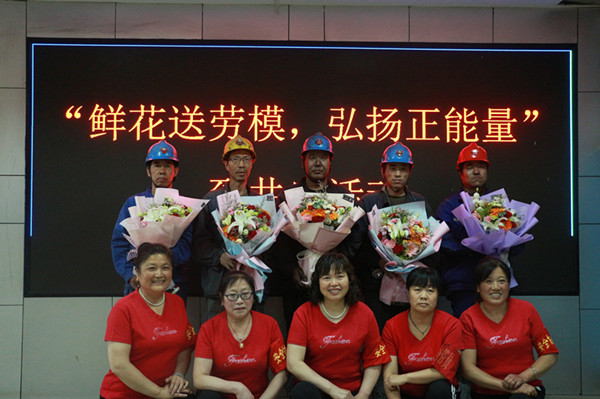 6月14日下午,玉華煤礦工會組織人員,在副井口候罐大廳為剛剛升井的勞動模范送上了馥郁的鮮花,表達對勞動模范的敬意和感激之情。