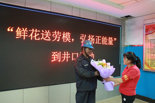 “師傅,您辛苦了!我代表職工家屬感謝您一直以來的辛勤工作,祝您工作順利,健康平安?!迸f(xié)管員一邊對入井人員進行安全叮囑,一邊遞上了鮮花。