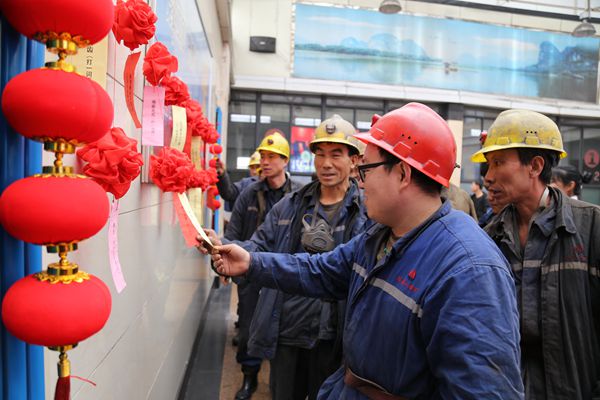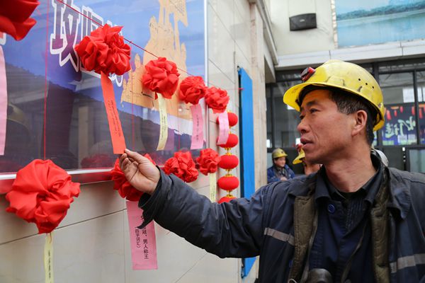“老袁,快來看這個(gè),幫幫我,答對(duì)了獎(jiǎng)品算你一半,正好也跟你學(xué)習(xí)學(xué)習(xí)?!薄白屛蚁胂氚。?,嗯……不按曲譜彈琴,應(yīng)該是違章操作吧?”綜掘二隊(duì)楊先方雙手拉著工友袁復(fù)軍的胳膊,兩人如同小孩子一般,開工前也樂呵呵了起來,大紅的燈籠懸掛人群的兩側(cè),歡聲笑語讓錚錚鐵骨露出柔情的一面。