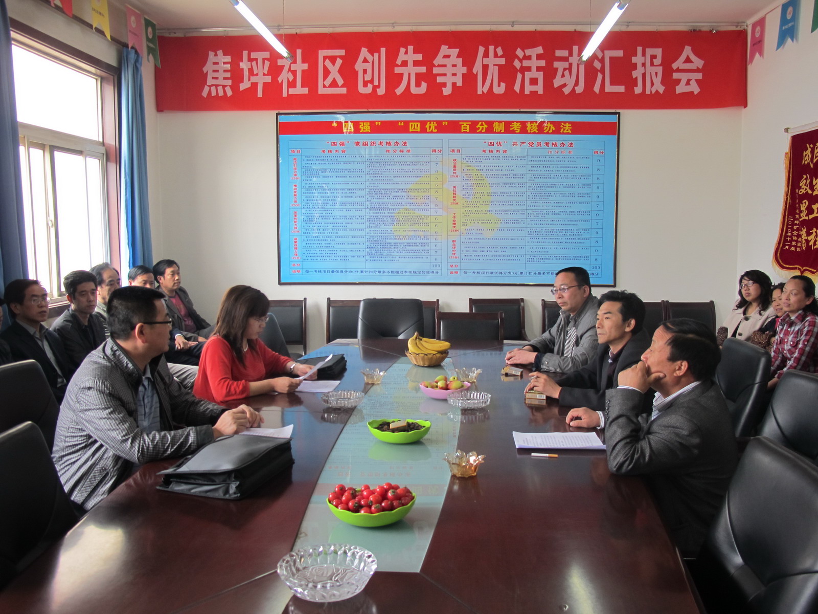 4月27日下午,公司(局)創(chuàng)先爭(zhēng)優(yōu)活動(dòng)領(lǐng)導(dǎo)小組一行到焦坪社區(qū)管理中心檢查指導(dǎo)工作。領(lǐng)導(dǎo)小組成員何剛、成冰芳、寇長(zhǎng)安、劉興、趙春雷聽(tīng)取了社管中心一年來(lái)在創(chuàng)先爭(zhēng)優(yōu)活動(dòng)中做的各項(xiàng)工作,按照檢查程序,社管中心離退休人員、女工、一線職工、機(jī)關(guān)部分代表15人對(duì)社管中心領(lǐng)導(dǎo)班子進(jìn)行了測(cè)評(píng),何剛一行檢查了各類資料和會(huì)議記錄,肯定了在以創(chuàng)建“四好”黨組織,“四優(yōu)”共產(chǎn)黨員為主要內(nèi)容的創(chuàng)先爭(zhēng)優(yōu)活動(dòng)中,能夠按照內(nèi)容和要求進(jìn)行,隊(duì)伍建設(shè)和黨員思想素質(zhì)不斷提高,服務(wù)群眾、服務(wù)職工意識(shí)不斷增強(qiáng),在民生建設(shè)和人居環(huán)境改善方面做了大量卓有成效的工作,職工群眾普遍滿意,充分發(fā)揮了黨委核心作用、黨支部戰(zhàn)斗堡壘作用和黨員先鋒模范作用。同時(shí),提出了在檢查當(dāng)中存在的問(wèn)題和今后整改的意見(jiàn)。