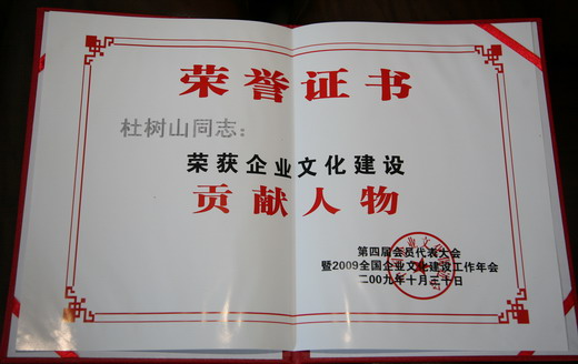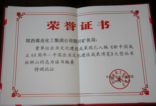 全國企業(yè)文化的盛會(huì)——“2009年全國企業(yè)文化建設(shè)工作年會(huì)暨第四屆會(huì)員代表大會(huì)”,10月29日至10月31日在山西太原召開,我局當(dāng)選為理事單位,杜樹山書記當(dāng)選為理事,礦務(wù)局被樹為全國企業(yè)文化建設(shè)“百佳”貢獻(xiàn)單位,局黨委書記杜樹山被評為“全國企業(yè)文化建設(shè)貢獻(xiàn)人物”,由杜書記任編委的《新中國成立60周年——中國企業(yè)文化建設(shè)成果博覽》大型叢書出版發(fā)行,銅川局企業(yè)文化建設(shè)成果入編此書。