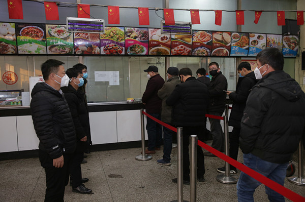 “年輕人嘛,吃飯時(shí)間比別人晚點(diǎn),辛苦一些不重要,可以為疫情防控工作盡一點(diǎn)綿薄之力,確保咋們的職工安全,一切都值得!”職工餐廳排隊(duì)的人群里,李偉正在耐心勸導(dǎo)盡量將飯菜帶回宿舍吃,吃飯時(shí)大家盡量少交談,看著職工就餐快結(jié)束了,這才拿出自己的碗筷打飯。