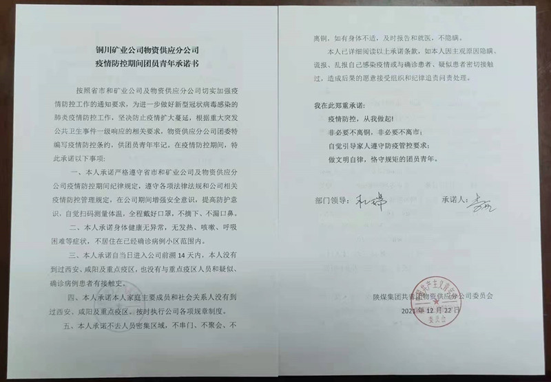 根據(jù)重大突發(fā)公共衛(wèi)生事件一級(jí)響應(yīng)的相關(guān)要求,該公司團(tuán)委組織團(tuán)員青年開(kāi)展疫情防控線上總動(dòng)員,人人做起寫(xiě)好疫情防控承諾書(shū),該公司53名團(tuán)員青年們主動(dòng)跟所在團(tuán)支部簽訂疫情防控承諾書(shū),紛紛表示,疫情防控,從我做起,非必要不離銅,非必要不離市,自覺(jué)倡導(dǎo)家人遵守防疫管控要求,做文明自律,恪守規(guī)矩的團(tuán)員青年,為疫情防控貢獻(xiàn)青春力量和青年正能量。
