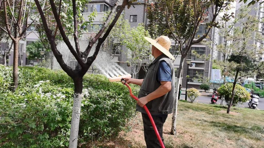 活動(dòng)現(xiàn)場(chǎng),該中心根據(jù)小區(qū)綠化覆蓋率和綠地面積比較大的分布特點(diǎn),將黨員和志愿者們分為兩組。一組黨員志愿者們利用的灑水車與手持式高壓噴淋設(shè)備,對(duì)梧桐等大型喬木實(shí)施根部滲透澆灌,對(duì)灌木叢和草地采用霧化噴淋,另一組黨員志愿者們拉起水管細(xì)心地把水澆向每一處綠化帶,確保每片植被都能“喝”上水,針對(duì)低矮的綠化灌木、根系淺、不發(fā)達(dá)、耐旱性差的加大澆水頻率,這樣既提升水資源利用率,又避免土壤板結(jié)。