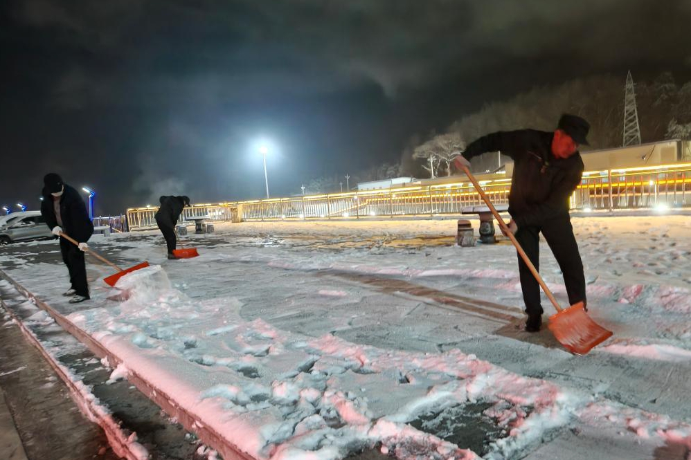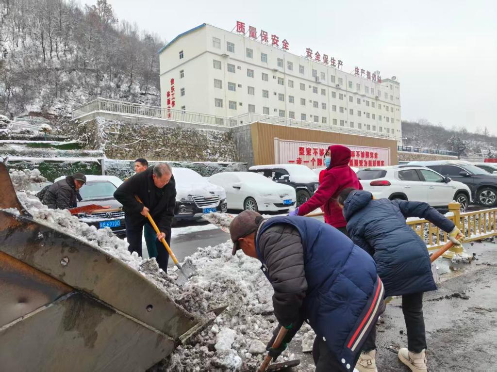 在各責任片區(qū),黨員干部率先垂范,帶領(lǐng)工作人員揮舞鐵鍬、掄起掃帚,清理主干道積雪,針對臺階、坡道等易滑區(qū)域,工作人員采用破冰清掃和撒鹽融雪的方式,反復清理積冰、細致排查隱患,確保不留死角、不留盲區(qū)。寒風凜冽中,大家分工協(xié)作、默契配合,鏟雪、掃雪、清運、撒鹽等工序有條不紊,凍紅的臉頰上洋溢著實干的熱情,忙碌的身影與皚皚白雪相映成趣,構(gòu)成了礦區(qū)冬日里最暖心的風景線。
