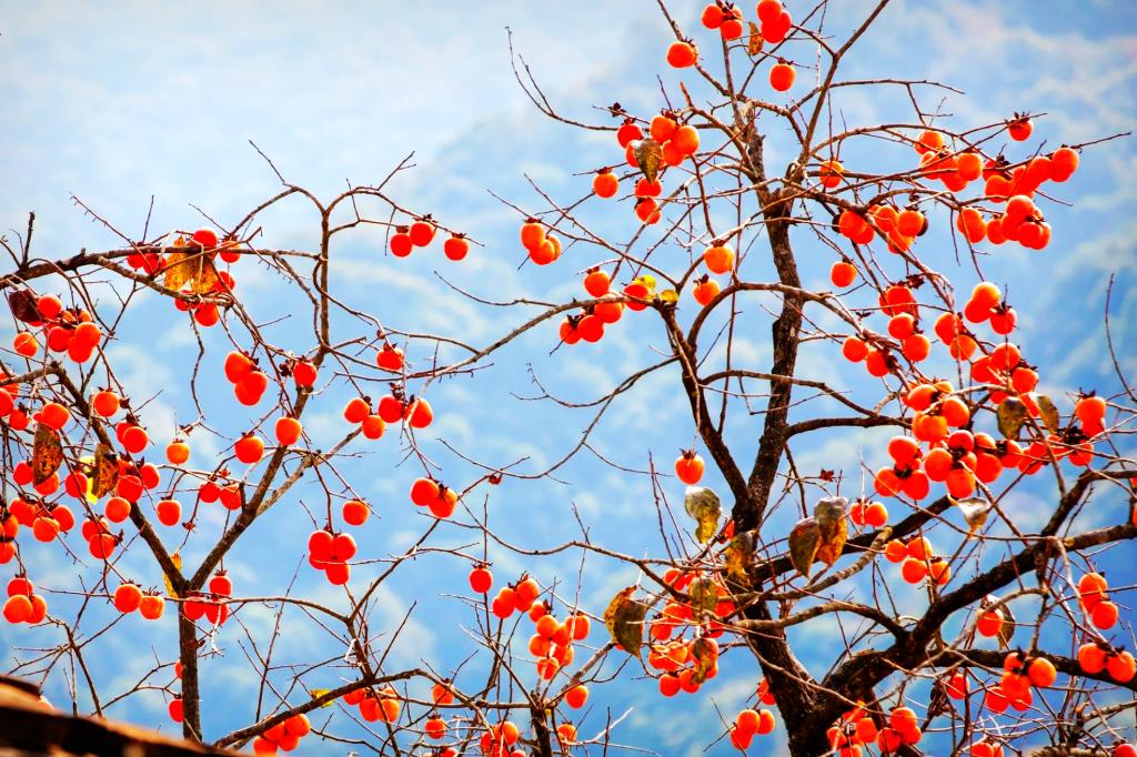 在山那頭,柿樹林依舊漫山遍野的紅,那一片片柿葉仿佛從天空墜下的紅霞綴滿樹冠,那一樹樹掛滿枝頭的柿子猶如燃燒的火球,它們好像等不及似的在樹上你用我擠。火紅的風(fēng)采浸染在了這片柿林,把柿林腳下的土地映襯得赤紅!柿樹裝扮著山前坡后,這是鄉(xiāng)村特有的秋韻,這是豐收的季節(jié)更是果農(nóng)們幸福的季節(jié)。