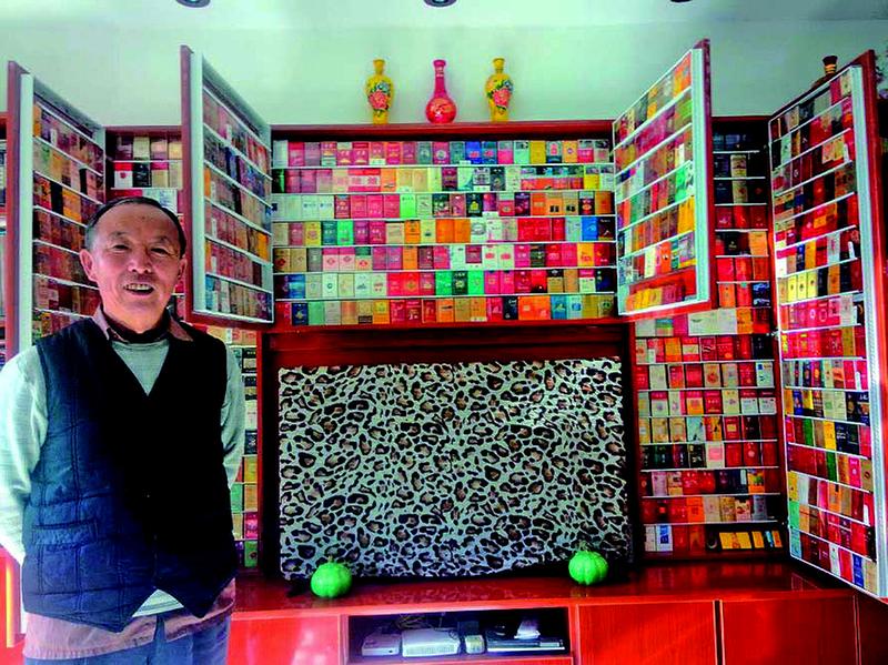 收藏?zé)熀?,李守貴樂在其中。他在空閑時間,把煙盒按動物、人物、花草、文物、山水、建筑等分門別類整理出來。有以地名命名的,如“北京”“天津”“南京”等;有以人物命名的,如“飛仙”“十二金釵”“諸葛亮”等;有以風(fēng)景區(qū)命名的,如“香格里拉”“黃果樹”“西湖”等……他用這些煙盒的名稱完成了一首《趣味煙盒對聯(lián)》?!疤┥饺A山五臺山,南京遵義金延安。茶花江花山丹花,喜梅紅梅一剪梅。薄荷百合羅布麻,荔枝芒果紅山茶。金猴大圣水簾洞,飛仙嫦娥牡丹亭。中華北京天安門,紅都延安東方紅。團結(jié)友誼大中華,國色天香阿詩瑪……”