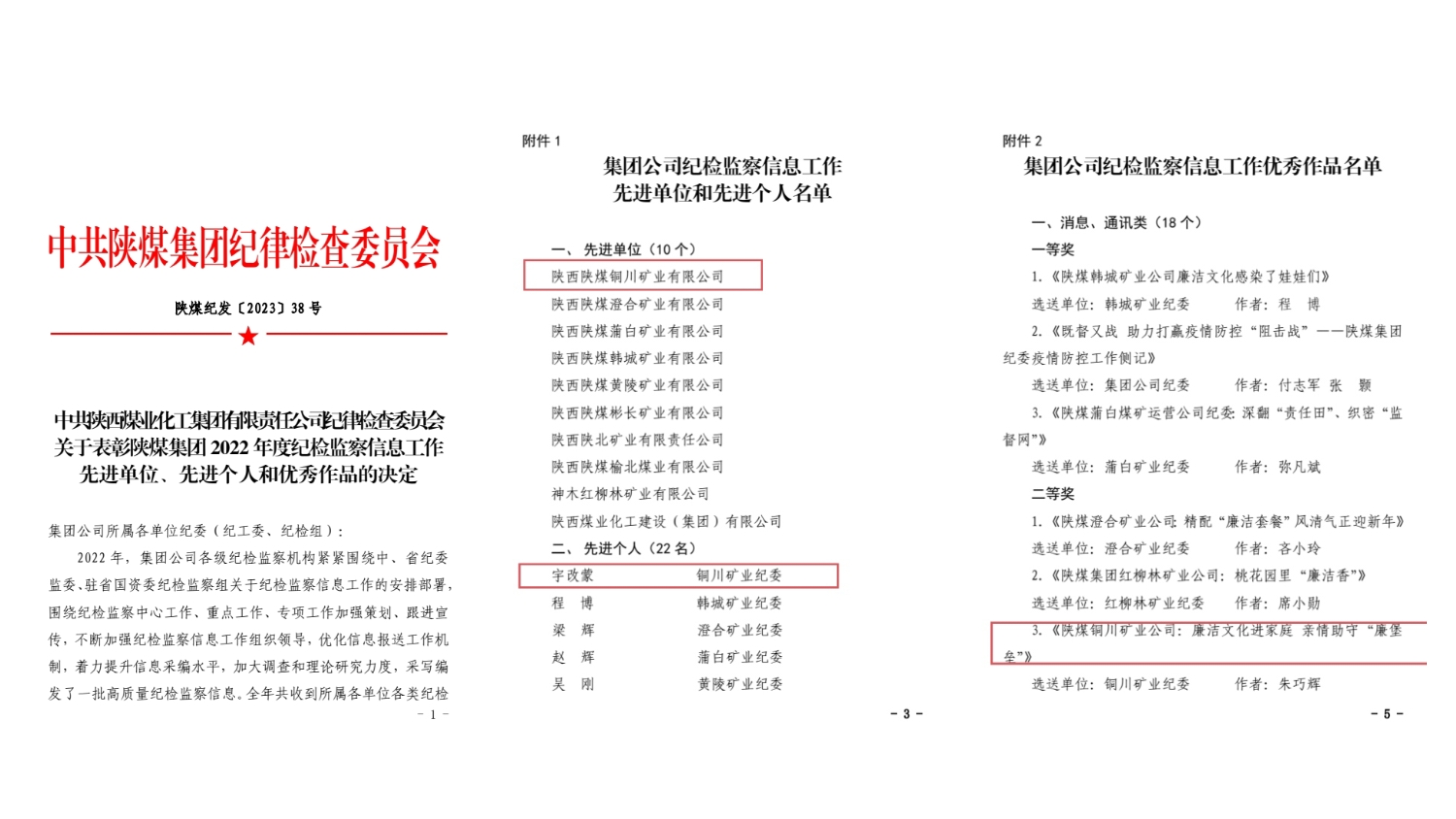 近日,陜煤集團(tuán)紀(jì)委印發(fā)《關(guān)于表彰2022年度紀(jì)檢監(jiān)察信息工作先進(jìn)單位、先進(jìn)個(gè)人和優(yōu)秀作品的決定》,公司被評(píng)為“紀(jì)檢監(jiān)察信息工作先進(jìn)單位”,1名紀(jì)檢同志被評(píng)為先進(jìn)個(gè)人。由公司紀(jì)委報(bào)送的《陜煤銅川礦業(yè)公司:廉潔文化進(jìn)家庭 親情助守“廉堡壘”》《陜煤銅川礦業(yè)柴家溝井:在推進(jìn)廉潔文化中鎖定目標(biāo)找準(zhǔn)奮進(jìn)坐標(biāo)》分別榮獲消息類、通訊類二、三等獎(jiǎng)。