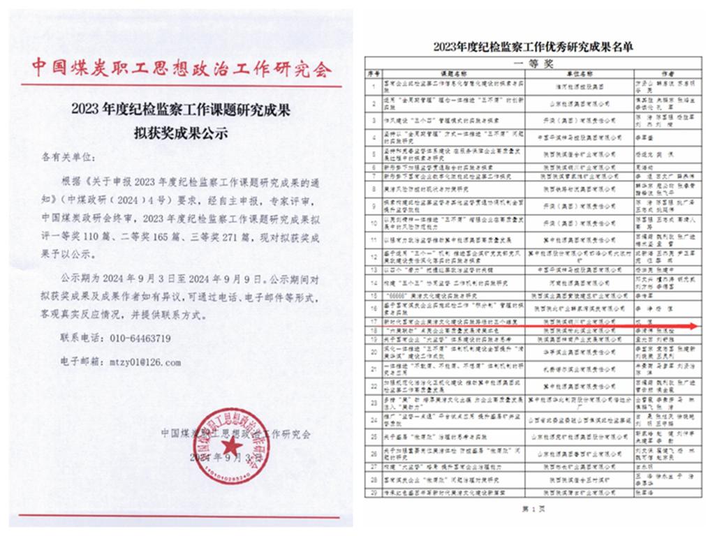 近日,在中煤政研紀(jì)檢監(jiān)察優(yōu)秀研究成果發(fā)布會上,公司紀(jì)委榮獲“2023年度紀(jì)檢監(jiān)察工作課題研究活動優(yōu)秀組織單位”命名表彰,此次活動是由中國煤炭職工思想政治工作研究會主辦,對紀(jì)檢監(jiān)察研究學(xué)組成員單位11個集體、547篇研究成果進(jìn)行了表彰。