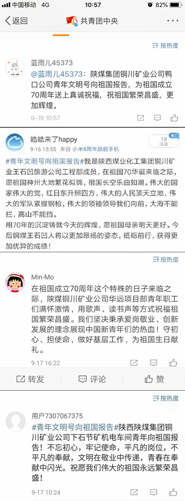“祝愿祖國(guó)母親繁榮昌盛、走向輝煌!我們將努力奮斗、錘煉本領(lǐng),讓青春閃耀煤海。銅煤青年向祖國(guó)報(bào)告!”