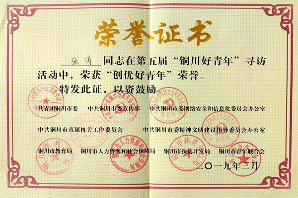 10月18日上午,團市委在銅川職業(yè)技術(shù)學(xué)院舉辦的關(guān)于開展2019年銅川市“我與祖國共奮進”青春故事匯暨第六屆“銅川好青年”尋訪活動大會上,對第五屆“銅川好青年”獲得者進行了現(xiàn)場頒獎表彰,銅川礦業(yè)公司青工張濤獲得銅川市“創(chuàng)優(yōu)好青年”殊榮。