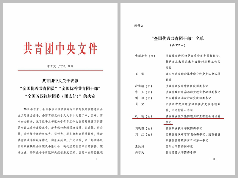 5月4日,團(tuán)中央發(fā)出《關(guān)于表彰“全國優(yōu)秀共青團(tuán)員”“全國優(yōu)秀共青團(tuán)干部”“全國五四紅旗團(tuán)委(團(tuán)支部)”的決定》,公司團(tuán)委書記孔艷同志被授予“全國優(yōu)秀共青團(tuán)干部”榮譽(yù)稱號(hào)。該獎(jiǎng)項(xiàng)是團(tuán)中央授予共青團(tuán)干部的最高榮譽(yù),全國共有357人獲此殊榮??灼G同志是陜西省國資委系統(tǒng)中唯一獲此稱號(hào)的團(tuán)干部。
