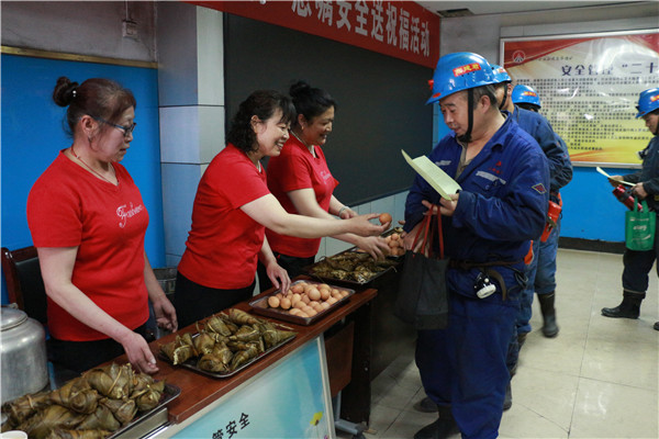 “師傅,端午節(jié)快樂!吃個(gè)粽子吧”,“天氣熱了,大家喝杯降溫茶,注意防暑!”,“祝您節(jié)日快樂!井下要注意安全??!”……,6月7日,適逢端午佳節(jié),又是全國第18個(gè)“安全生產(chǎn)月”活動(dòng)火熱開展之際,玉華煤礦候罐大廳里迎來一群“特殊客人”,家屬安全協(xié)管員和團(tuán)員青年志愿者為即將下井工作的職工們送來了香氣四溢的粽子和飽含親情的安全叮囑。