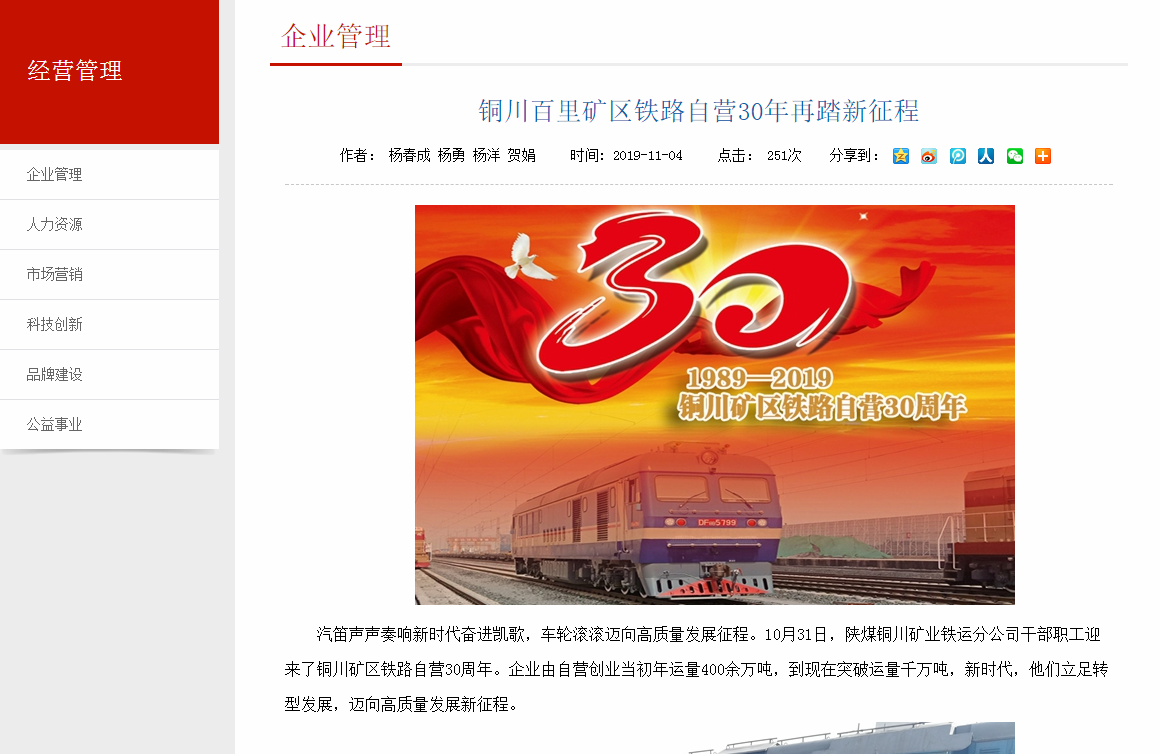 汽笛聲聲奏響新時(shí)代奮進(jìn)凱歌,車輪滾滾邁向高質(zhì)量發(fā)展征程。10月31日,陜煤銅川礦業(yè)鐵運(yùn)分公司干部職工迎來了銅川礦區(qū)鐵路自營30周年。企業(yè)由自營創(chuàng)業(yè)當(dāng)初年運(yùn)量400余萬噸,到現(xiàn)在突破運(yùn)量千萬噸,新時(shí)代,他們立足轉(zhuǎn)型發(fā)展,邁向高質(zhì)量發(fā)展新征程。