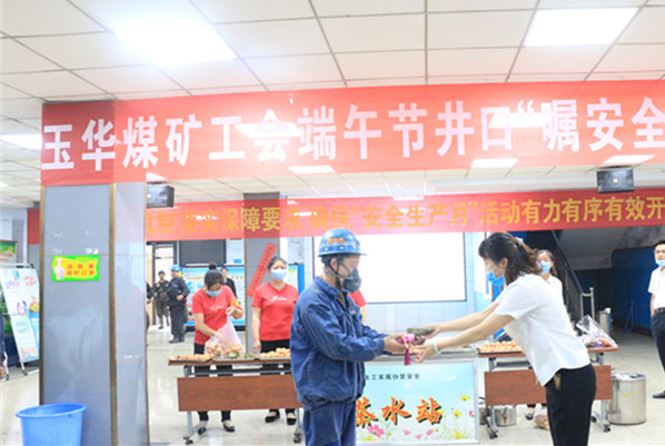 6月25日,全國第19個“安全生產月”活動深入開展之際,又適逢端午節(jié),玉華煤礦工會在副井口候罐大廳,舉辦了一場“節(jié)日囑安全、送祝?!被顒?,為即將入井職工送上一枚香甜的粽子,端上一杯熱茶,道一聲端午節(jié)安康。