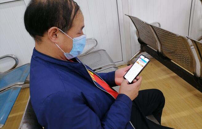在項(xiàng)目部綜掘一隊(duì)下午班前會(huì)召開之前,職工趙文紅正在通過手機(jī)微信閱讀掘進(jìn)施工安全技術(shù)知識要點(diǎn)。
