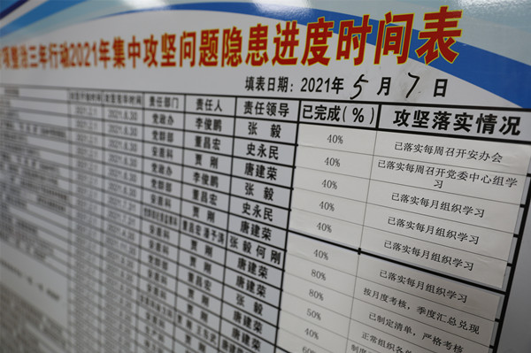 集中攻堅“時間表”選擇擺放在調(diào)度指揮中心及候罐大廳,在職工上下班必經(jīng)之地進(jìn)行公示,將各專業(yè)安全責(zé)任落實拉出來“曬一曬”,使業(yè)務(wù)科室和基層單位的執(zhí)行能力“亮亮相”,讓全員自查安全意識行為“照鏡子”,主動把集中攻堅的過程和結(jié)果置于廣大職工監(jiān)督之下,傳導(dǎo)壓力匯聚合力解難題,每天看到新變化新進(jìn)展,堅定打贏硬仗的信心和安全發(fā)展的決心,由守勢轉(zhuǎn)攻勢,全力推進(jìn)集中攻堅。