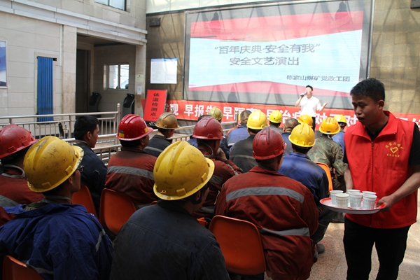 為在“安全月”中營(yíng)造濃厚的安全生產(chǎn)氛圍,豐富職工文化生活,動(dòng)員一線職工戰(zhàn)高溫、斗酷暑,打好安全攻堅(jiān)戰(zhàn),陳家山礦在井口開(kāi)展“送清涼送文藝井口”活動(dòng),為高溫下堅(jiān)守崗位的一線職工送去“清涼茶”和精彩的文藝演出?;顒?dòng)現(xiàn)場(chǎng),伴隨著優(yōu)美的歌聲中,該礦團(tuán)委還為職工們送去了“綠豆湯”,把無(wú)微不至的關(guān)愛(ài)送到職工的手中、心上。