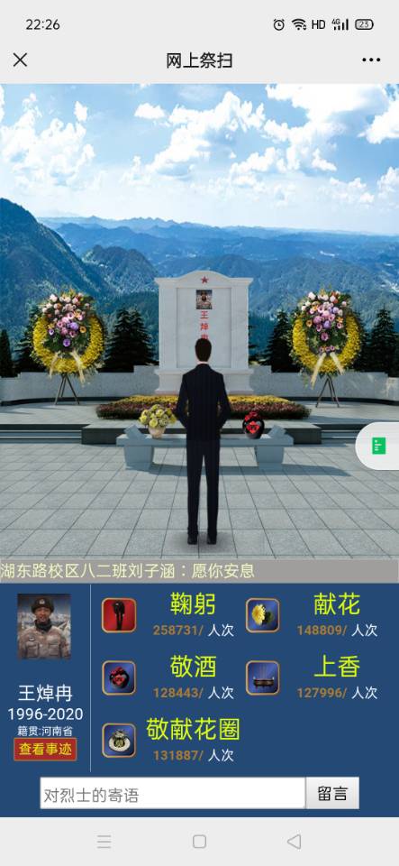 大家通過(guò)登錄中華先烈網(wǎng)“網(wǎng)上祭英烈”專區(qū),參加形式多樣的網(wǎng)上祭掃,進(jìn)行網(wǎng)上獻(xiàn)花、網(wǎng)上留言、網(wǎng)上祭奠等活動(dòng),寄托對(duì)革命先輩無(wú)盡的哀思,表達(dá)對(duì)革命先烈由衷的崇敬,抒發(fā)傳承先烈革命精神,為實(shí)現(xiàn)民族復(fù)興“中國(guó)夢(mèng)”而不懈奮斗。