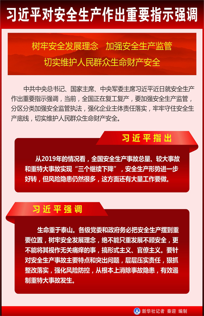 中共中央政治局常委、國務院總理李克強作出批示指出,當前,全國正處于統(tǒng)籌推進新冠肺炎疫情防控和復工復產(chǎn)的關(guān)鍵時期,安全生產(chǎn)意識和工作絲毫不能放松。各地區(qū)、各有關(guān)部門和各單位要堅持以習近平新時代中國特色社會主義思想為指導,認真貫徹落實黨中央、國務院決策部署,樹牢安全發(fā)展理念,層層壓實責任,深入排查各領(lǐng)域各環(huán)節(jié)安全生產(chǎn)隱患,全面開展安全生產(chǎn)專項整治三年行動,堅持系統(tǒng)治理、精準施策,扎實推進危險化學品、礦山、交通運輸、工業(yè)園、城市建設(shè)、危險廢物等重點領(lǐng)域安全整治,確保見到實效;加快建立健全安全生產(chǎn)責任和管理制度體系、隱患排查治理和風險防控體系,加強監(jiān)管執(zhí)法和安全服務,堅決遏制重特大事故發(fā)生,切實維護人民群眾生命財產(chǎn)安全。