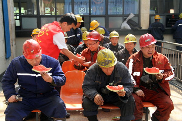 “西瓜甜在嘴里,茶水暖在心田,這些年,礦黨政一直都牽掛著我們,冬天送溫暖,夏天送清涼,節(jié)日送祝福,讓我們時時刻刻能感受到大家庭的溫暖?!痹谠摰V井口,職工們一邊吃著西瓜,一邊表達著對眼前正忙碌著切西瓜、送茶水的青年志愿者們的感激。