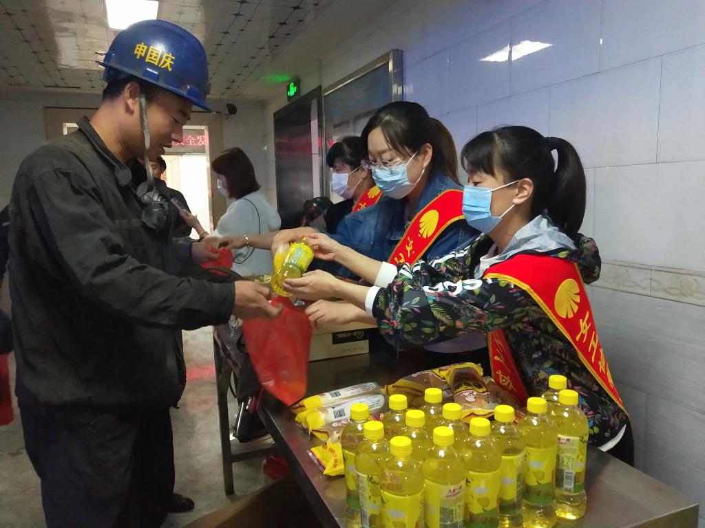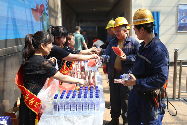 陳家山礦井口候車場“清涼一夏 井口囑安”活動現(xiàn)場,該礦女工家屬協(xié)管員們將一塊塊切好的西瓜、洗好的鮮桃、蘇打水、棗悅等飲品送到職工手中,讓清涼與親情與職工相伴。