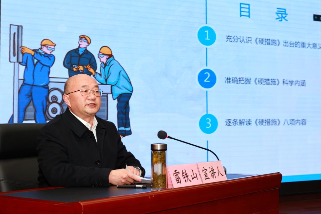 雷鐵山在宣講時要求,公司上下要不折不扣對照《硬措施》各項要求,把握精神實質(zhì),細(xì)化工作措施,堅持問題導(dǎo)向,組織開展好自查自改工作,建立問題隱患清單和整改措施清單,通過夯實安全基礎(chǔ),構(gòu)建長效機制,不斷提升礦井安全管理水平。