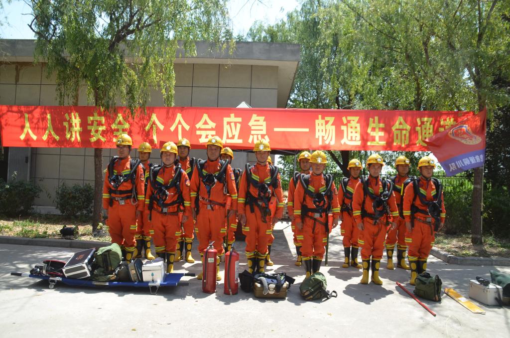 烈日如火,濃煙彌漫,在氣溫高達38℃的炎熱氣候下,他們身著戰(zhàn)斗服,佩戴沉重的正壓氧氣呼吸器和全面罩,迅速集結(jié)在模擬巷道入口,正在進行一場模擬礦井火災的高溫濃煙實戰(zhàn)演習。