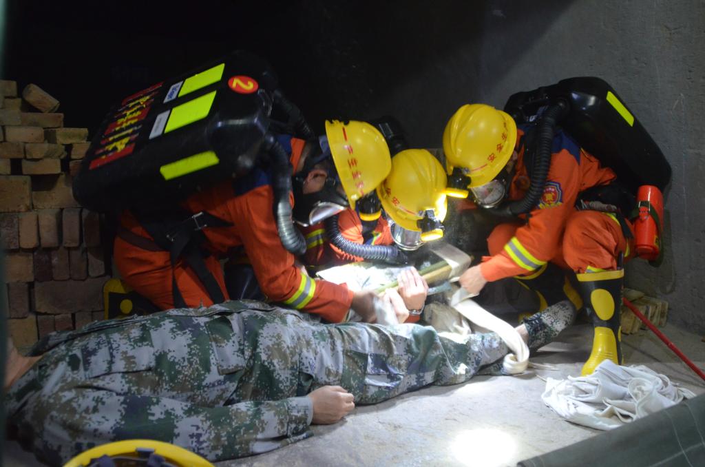 演練過程中,指戰(zhàn)員們充分發(fā)揚特別能吃苦、特別能奉獻、特別能戰(zhàn)斗的精神,憑借極大的意志力和專業(yè)救援能力,在規(guī)定時間內(nèi)圓滿完成災區(qū)偵察、搬運傷員、建造木板密閉墻、安裝局部通風機等所有演習科目。