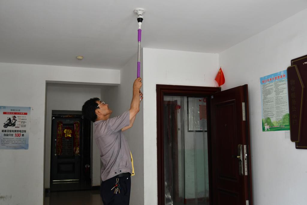 “過去換燈泡,扛梯子、爬高、小心翼翼,一個(gè)活下來(lái)汗流浹背不說(shuō),效率還低?!本S修部工作人員道出了工作中的難點(diǎn)。面對(duì)這個(gè)看似尋常卻存在安全隱患、消耗人力的難題,物業(yè)團(tuán)隊(duì)沒有選擇申請(qǐng)經(jīng)費(fèi)購(gòu)置設(shè)備,而是想方設(shè)法精打細(xì)算,資源挖潛。“我們琢磨著,能不能不花錢,或者花最少的錢解決它?”帶著這個(gè)樸素的想法,維修工們化身“發(fā)明家”,他們翻找倉(cāng)庫(kù)角落,利用廢棄拖把的伸縮桿加上礦泉水瓶子剪掉一半,剛好能放進(jìn)去節(jié)能燈泡,礦泉水瓶外部纏電工膠帶進(jìn)行絕緣,內(nèi)部貼有雙面膠及電工膠帶,增大摩擦力,抓握燈泡,更換燈泡時(shí)不用梯子,直接將前端伸向壞掉的燈泡,擰下進(jìn)行更換。整個(gè)制作過程,幾乎沒有產(chǎn)生新的物料采購(gòu)費(fèi)用,真正實(shí)現(xiàn)了“變廢為寶”。這個(gè)“換燈神器”設(shè)計(jì)通過反復(fù)調(diào)試、動(dòng)手組裝,全部由維修團(tuán)隊(duì)利用工余時(shí)間完成,這省出來(lái)的每一分錢,都是對(duì)過“緊日子”理念的見行見效。