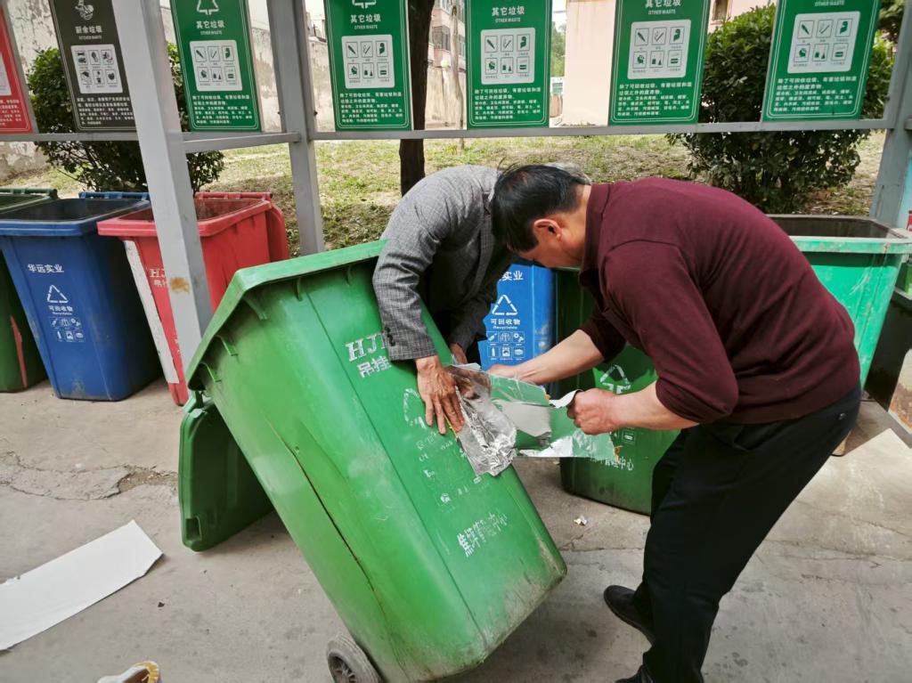 垃圾桶“煥新”:小修復省下大成本 該中心垃圾桶因長期使用,部分出現(xiàn)裂縫、破損等問題,若按常規(guī)換新,需投入不少費用。管理中心職工主動踐行“賺錢思維”,自發(fā)組成“修復小隊”。他們準備好強黏合力防水膠帶、鐵絲等材料,對破損垃圾桶進行“手術(shù)”,先用鐵絲對裂縫處打孔縫合加固,再用膠帶分別對垃圾桶內(nèi)外進行粘補,一番操作后,原本“傷痕累累”的垃圾桶又重新“上崗”。