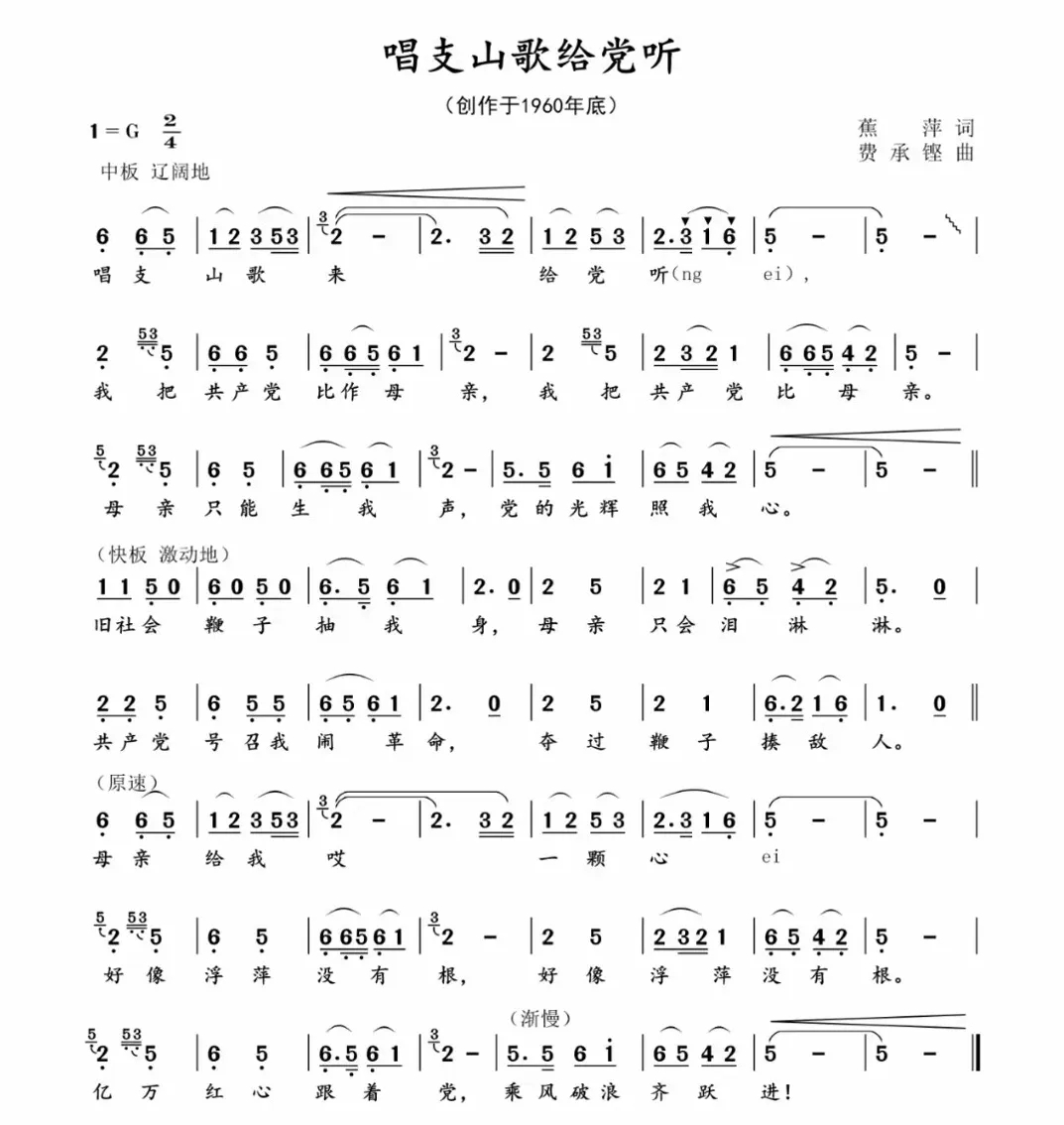 費(fèi)承鏗先生是個(gè)務(wù)實(shí)的人,他肯定認(rèn)為創(chuàng)作于“大躍進(jìn)”時(shí)期的不少歌曲不符合事實(shí)和文藝創(chuàng)作規(guī)律,正因?yàn)椤敖镀肌边@首歌頌“大躍進(jìn)”歌詞較為含蓄,且本質(zhì)上是歌頌共產(chǎn)黨、歌頌新社會(huì)的,所以費(fèi)承鏗先生為《唱支山歌給黨聽》歌詞進(jìn)行了譜曲。遺憾的是,當(dāng)費(fèi)承鏗先生于1960年譜成《唱支山歌給黨聽》一歌時(shí),國(guó)家正叫停“大躍進(jìn)”,因此,費(fèi)承鏗先生創(chuàng)作的《唱支山歌給黨聽》一出生便被打入了“冷宮”。直到吳躍華教授在整理費(fèi)教授遺物時(shí)才發(fā)現(xiàn)了這首歌。